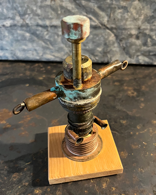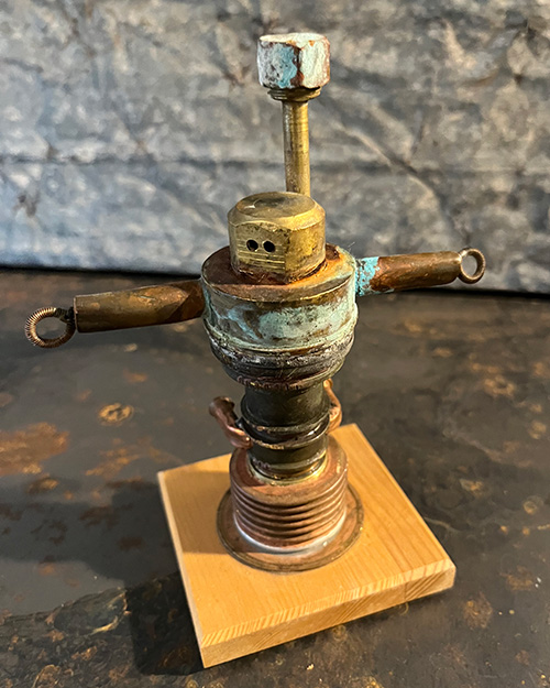 Axiom the Astrolabe is a curious creature from Jasper Hawthorn’s fantastical assemblage, embodying the spirit of celestial navigation and the wisdom of the stars. With a head that resembles an ancient mariner’s tool, Axiom’s gaze is fixed upon the heavens, forever calculating the courses of celestial bodies.