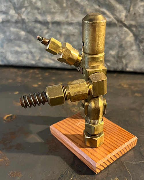 Boltzmann the Builder is an industrious member of Jasper Hawthorn’s mechanical menagerie, a stout sentinel of construction and craft. His body, an assembly of solid brass fittings, showcases the sturdiness and reliability one expects from a master builder. The head, a geometric marvel, is a nod to the blueprints and precision required in the art of creation.