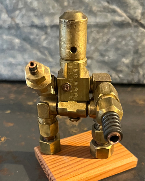 With arms that resemble the robust bolts and nozzles found in heavy machinery, Boltzmann is equipped to handle the most arduous tasks with a steady hand and an unwavering resolve. His stoic posture upon the cedar base is both a firm foundation and a platform from which his helpful nature is projected.