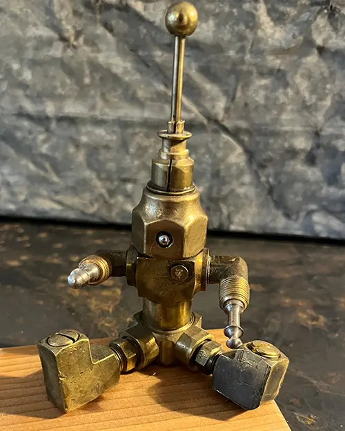 Coggins’ legs, stout blocks of metal, are like the weights of a grandfather clock—solid, unyielding, and timeless. His arms, fitted with various knobs and dials, are adept at making minute adjustments to the machinery around him, calibrating and fine-tuning as the need arises.