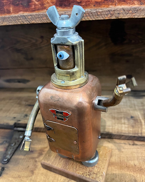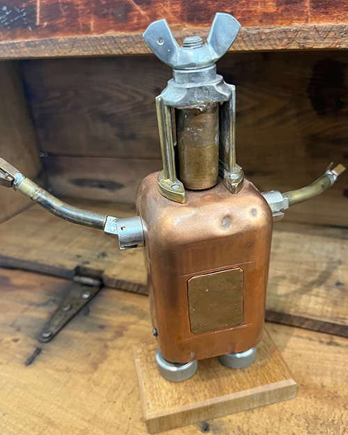 Copper Claude is a charismatic character with a lustrous copper body that gleams with tales of yesteryear. The body, repurposed from a vintage tube type radio, speaks to Claude’s past life as a vigilant guardian against boredom. Now, it serves as a vessel for his kind-hearted spirit. His head, a remnant of a dismantled faucet topped with a wing nut, may suggest he’s ready to pour out wisdom or perhaps a good story.