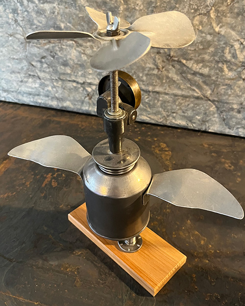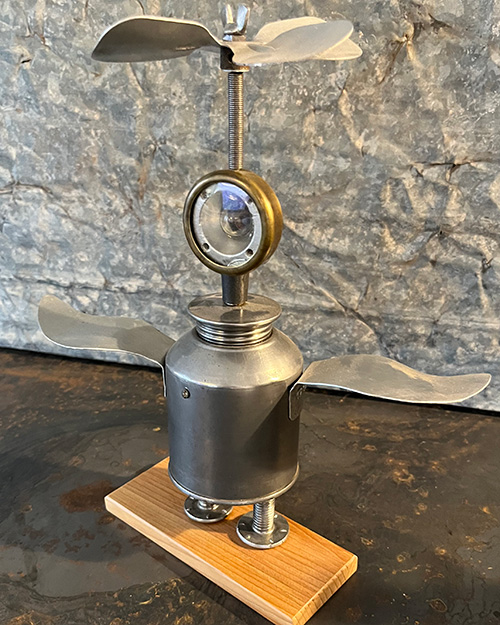 Gyro the Navigator is a whimsical creation from the mind of Jasper Hawthorn, a robot whose very structure is an homage to the art of exploration. With blades that mimic the wings of a dragonfly, Gyro is designed to dance on the drafts of imagination that swirl through the workshop.