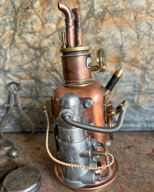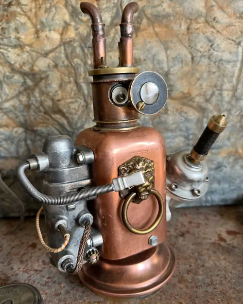 The copper Lion Sentinel is a noble guardian crafted from the warm hues of copper and the gleam of polished steel. With intricate pipes curling like a mane around its stately lion’s head knocker, this robot exudes a regal charm. Its single, watchful eye scans the horizon, ever alert to the needs of its domain. The Sentinel’s robust body, adorned with brass and endowed with a heart of gears, ticks in rhythm to the bustling life of the workshop. It’s not just a figure of protection but also a symbol of the enduring artistry found within the walls of its creator’s realm. Its presence is both an ode to the past’s craftsmanship and a beacon of inspiration for the future’s innovations.