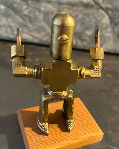 Pipette the Artisan is a charming automaton designed by Jasper Hawthorn, with delicate copper tubing for arms that reach out as if to embrace the world with its craftsmanship. Its cylindrical brass head, smooth and reflective, is reminiscent of an artist’s careful gaze, observing and contemplating the beauty in the details.