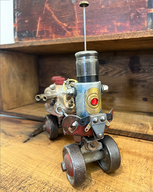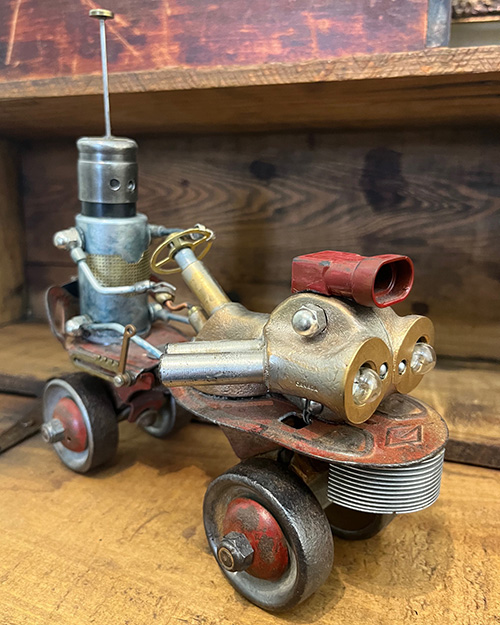 Rusty Racer is a whimsical robot with a need for speed and a penchant for the past. Constructed from a fusion of antique cast brass and machined parts to form an old-fashioned racing engine. Rusty’s body is riding on a set of vintage wheels that have clearly rolled through time. His head, a repurposed filter topped with a lightning rod, surveys the world with a curiosity that’s as sparky as its aerial. Rusty is more than a robot; He’s a nostalgic nod to the golden era of racing, a mechanical memento that carries the soul of adventure. This little racer has stories to tell, each dent and scratch on its frame a testament to the races it has imagined winning throughout the decades. Jasper Hawthorn, the creator, believes that every creation should not only have a function but also a spirit – and Rusty Racer has spirit in spades.