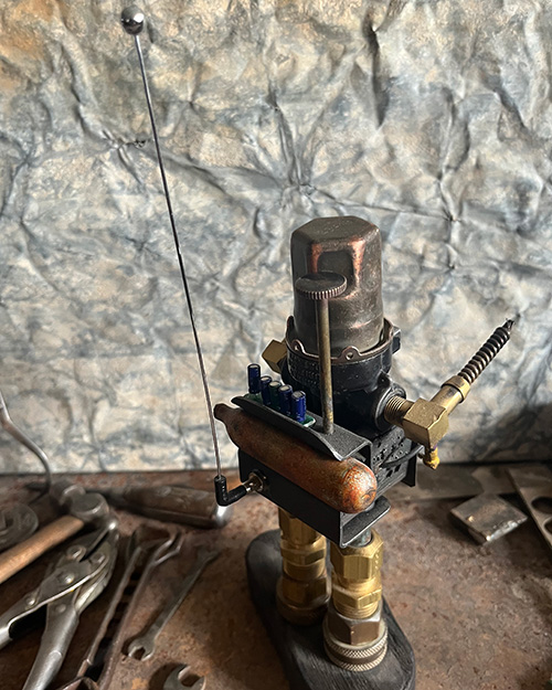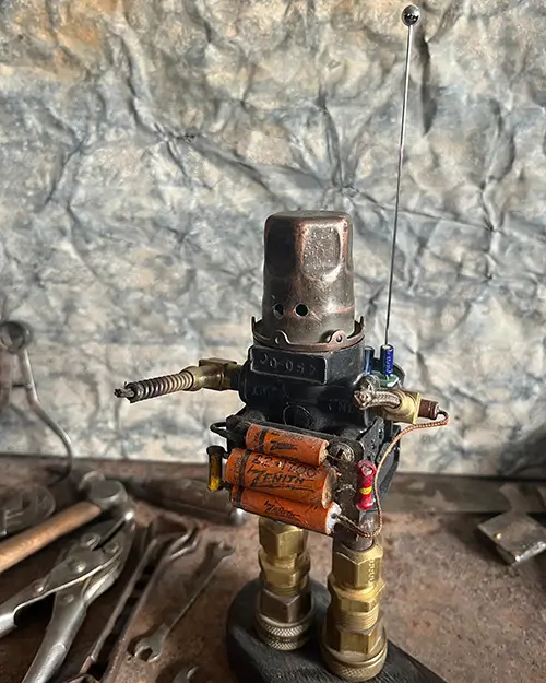 The Volt Vagabond is a charming robot sculpted from the remnants of a bygone era. Its torso, a vibrant assemblage of old clock works and weathered brass fittings, hums with a history only it knows. The head, a repurposed metal canister, still bears the faint scars of its previous life, giving the Vagabond a face marked with stories. In one hand, it holds a miniature red, fabric reminder of its place of origin, a nod to its creator’s whimsical touch. This robotic relic stands proudly, a sentinel of creativity, embodying the spirit of rediscovery and the endless possibilities of imagination. It is Jasper Hawthorn’s (not his real name) tribute to the enduring charm of the antiquated and the overlooked, a mechanical masterpiece born from the whispers of the past.