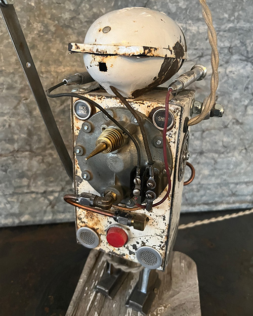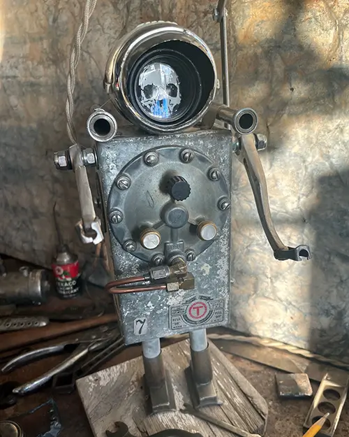 Voltan the Illuminist is a creature born from the fusion of function and fantasy within the walls of Jasper Hawthorn’s workshop. His body, a patchwork of metallic parts, carries the essence of energy harnessed and repurposed. Atop his frame sits a lamp head, a beacon in the dim corridors of creation, casting a soft glow upon the ideas blooming in the darkness.
